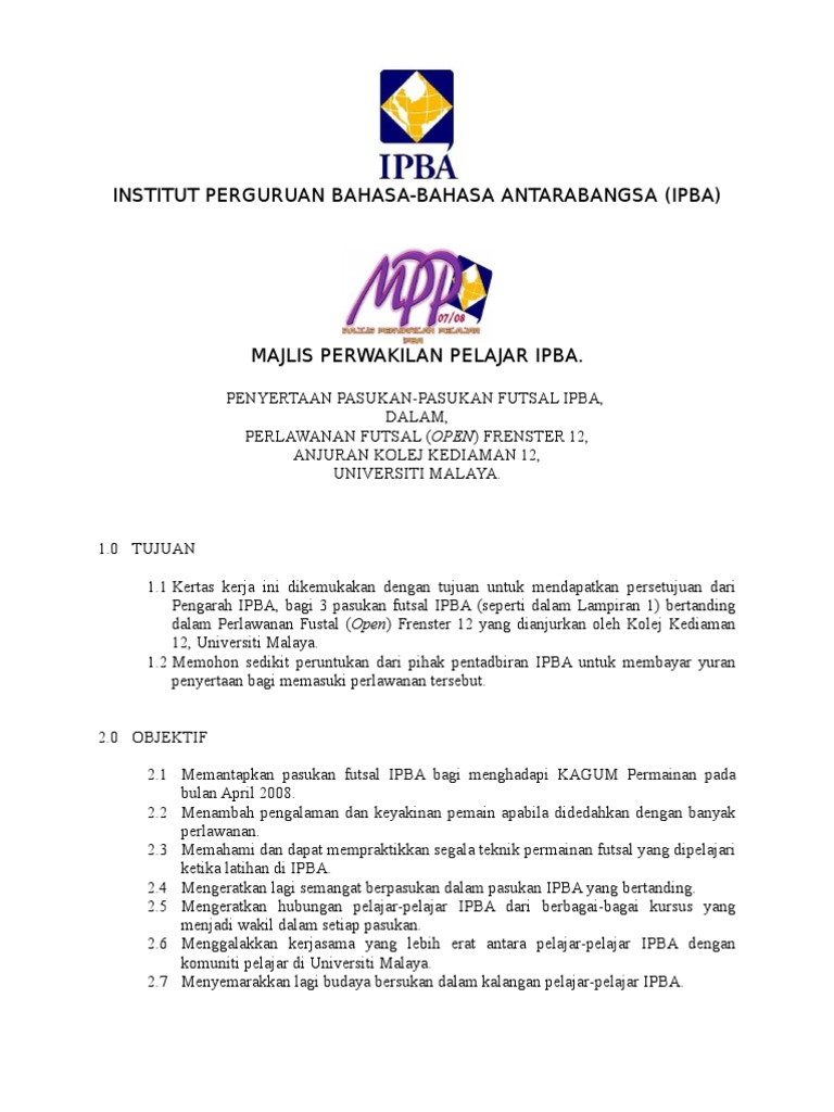 Yuran penyertaan satu peserta rm 15 diperlukan. Pendahuluanfutsal adalah satu bentuk permainan bola sepak dalaman yang terletak di bawah naugan fifa yang kertas kerja ini dibuat atas dasar memohon kebenaran pihak atasan untuk menganjurkan karnival sukan mini pertandingan futsal peringkat. Text of kertas kerja pertandingan robotik. Ukuran lapangan futsal harus disesuaikan dengan standar yang telah dibuat oleh fifa, baik itu pertandingan tingkat. Mengelola pertandingan mengelola pertandingan harus memperhatikan sumber hukum sebagaimana tercantum dalam fifa futsal laws of the game dan peraturan khusus pertandingan futsal yang di susun oleh pengelola.